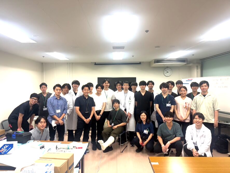 実際にモデルや互いの脚を使って、現場で役立つ知識と技術をじっくり学んでいただきました!研修医の先生たちも、ギプスを実際に巻いたことはないという方がほとんどでしたので、いい経験になったと思います。今回の経験は明日からの救急対応などでも活用いただけたら最高です!