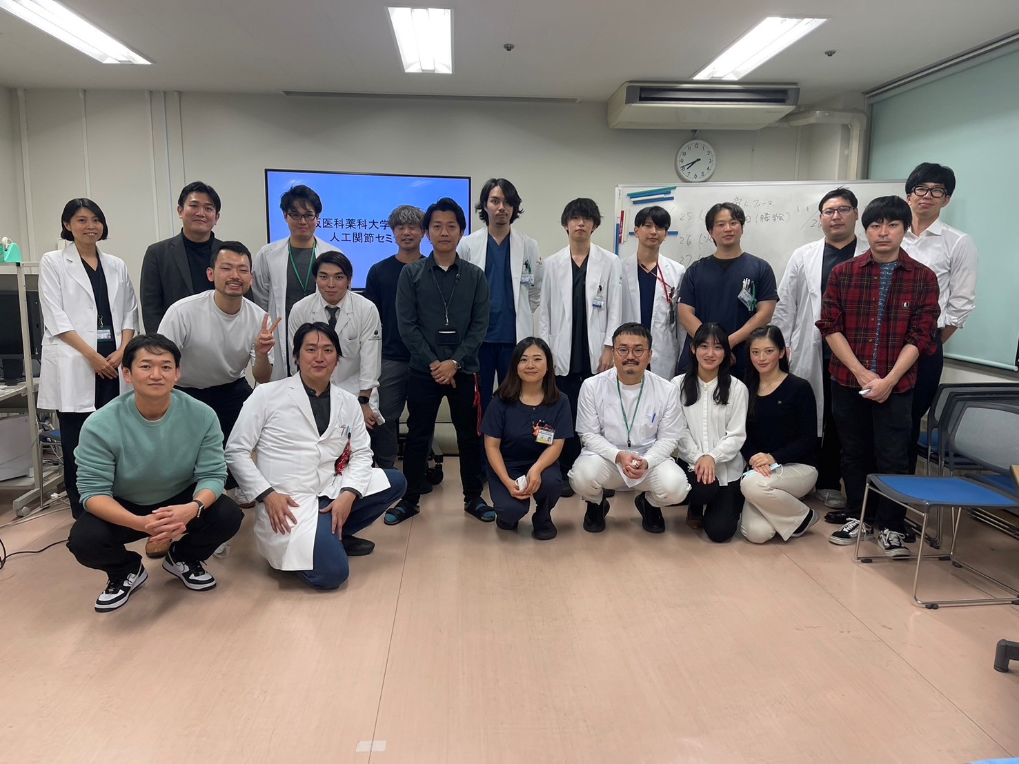 11月25日、模擬骨を用いた人工関節セミナーを開催しました。このセミナーは、普段手術では触る機会が少ない人工膝関節の手技を、模擬骨を用いて最新のナビゲーションやARの技術を体験することを目的とした企画でした。平日月曜の開催にもかかわらず、合計22名の参加者が集まりました。医学生の先生はボーンソーで怪我をする可能性があったため、残念ながら今回は研修医の先生のみの対象となりました。(また、研修医になられた際にはぜひご参加ください!)