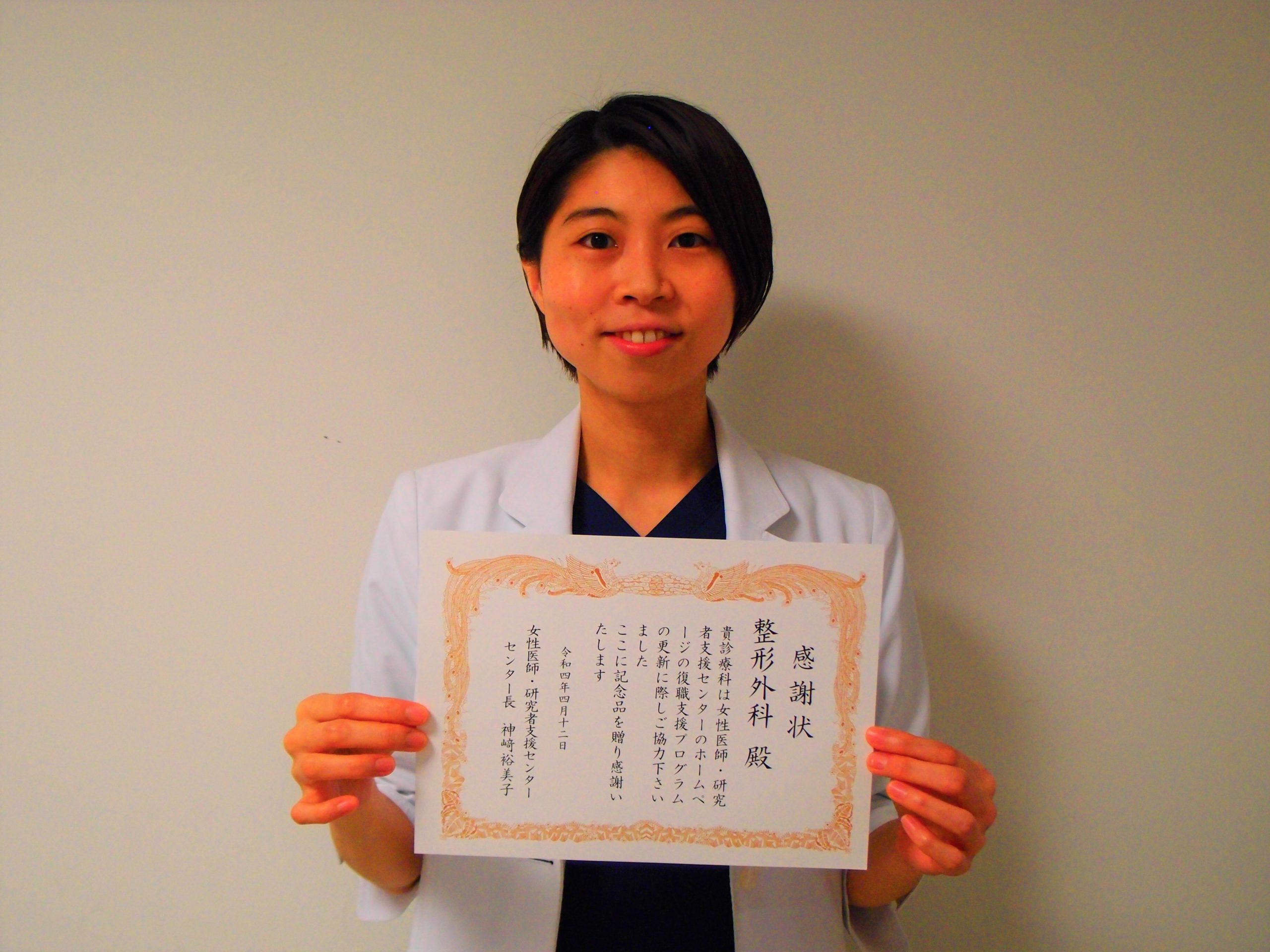 この度、女性医師研究者支援センターより、当医局ホームページ内の女性医師支援ページに対して感謝状を頂きました。私の入局後4年が経過しますが、4人もの女性医師が新たに入局して下さり、心より嬉しく思います。今後、益々の大阪医科薬科大学整形外科学教室の発展を願っています。