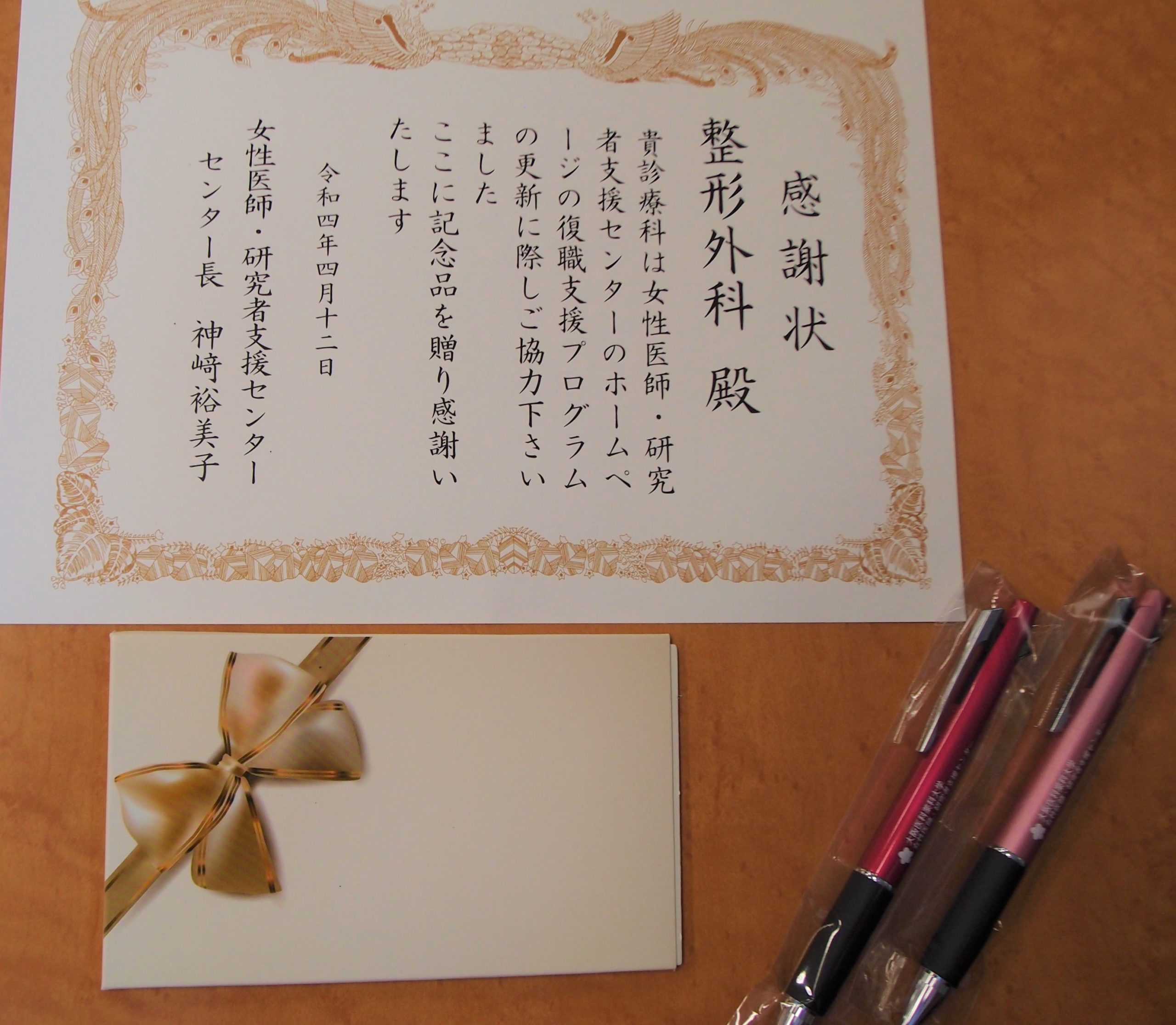 女性医師研究者支援センターより感謝状を頂きました