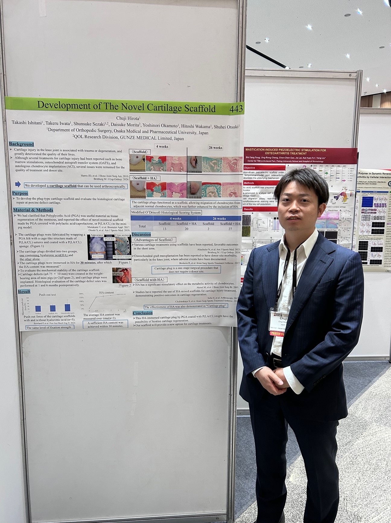 2025年4月24日〜27日に韓国・仁川にて開催されたOsteoarthritis Research Society International(OARSI)に参加し、ポスター発表を行いました。OARSIは、変形性関節症(OA)の研究と治療に関する国際的な学術団体であり、世界中の研究者、医療従事者が集まる学会になります。毎年、OAの最新の治療法や研究結果が発表され、特に治療法の革新や研究の進展について学ぶ貴重な機会です。