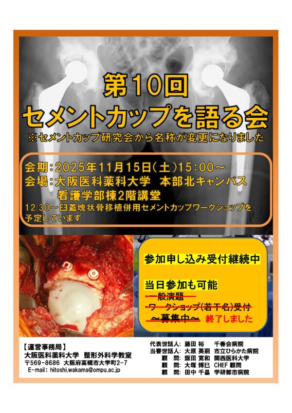 2025年11月15日(土)に大阪医科薬科大学 本部北キャンパス 看護学部棟2階講堂にて『第10回セメントカップを語る会(旧セメントカップ研究会)』を開催いたします。当日参加可能です。