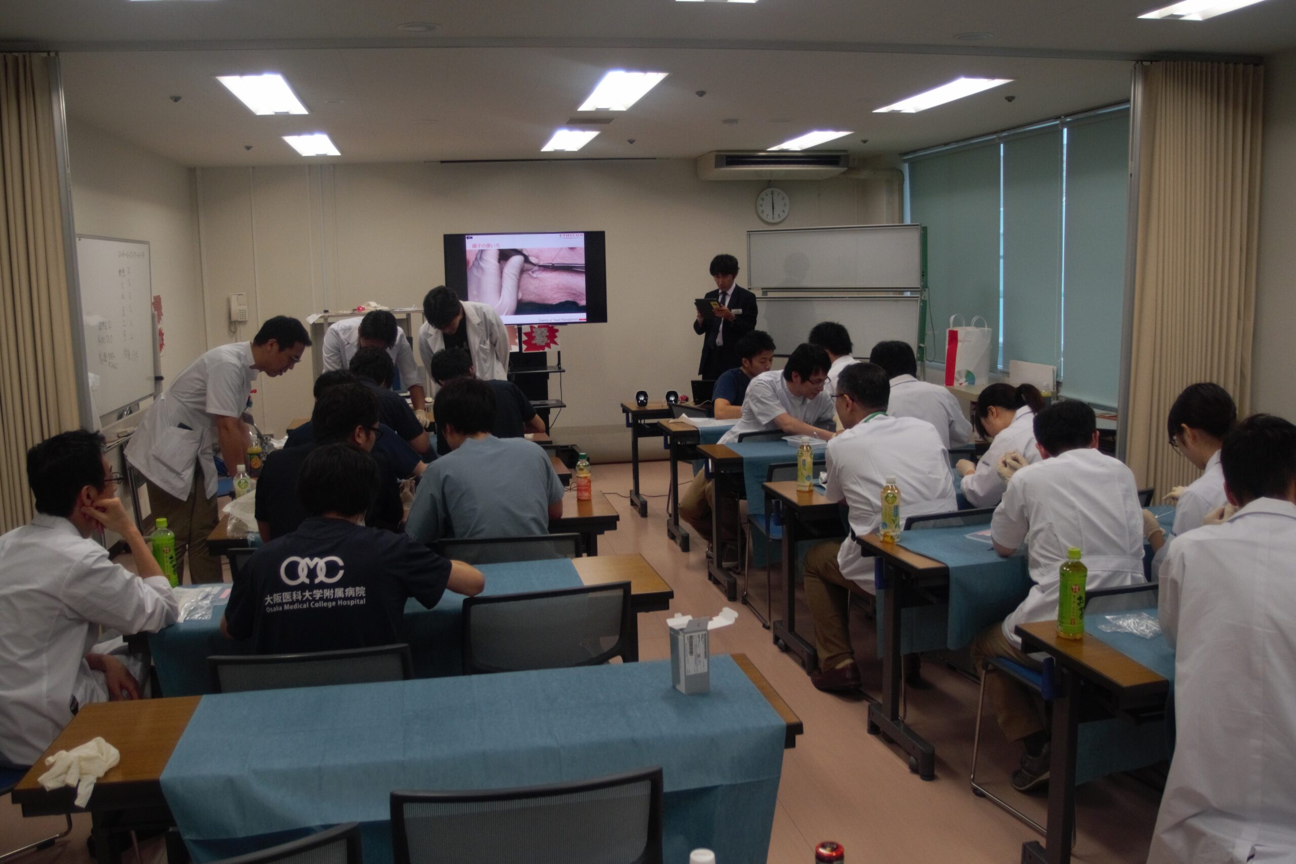 その後、19時から高槻市内のえい参で、参加していただいた研修医を中心に入局説明会がとり行われ、上手い酒、料理を楽しみながら、縫合実習の成果を語り合いました。