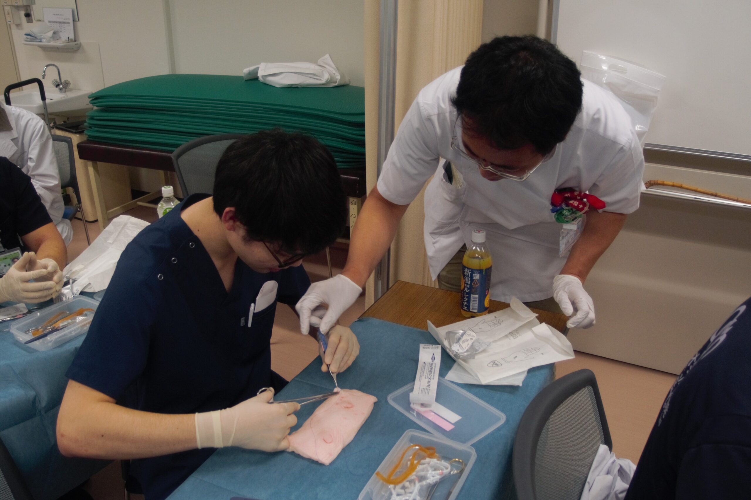 外科に興味のある院内や院外の研修医、クリクラで研修中の学生、あわせて15人ほどに参加していただきました。はじめに真皮縫合の基本手技ビデオを供覧し、整形外科スタッフがマンツーマンで縫合指導を行いました。真皮縫合が習得できた実習生は、ダーマボンドを用いた皮膚固定にも挑戦していました。参加した研修医、学生は、明日から実践で縫合できるぐらいの技術を習得し、充実した1時間を過ごされました。