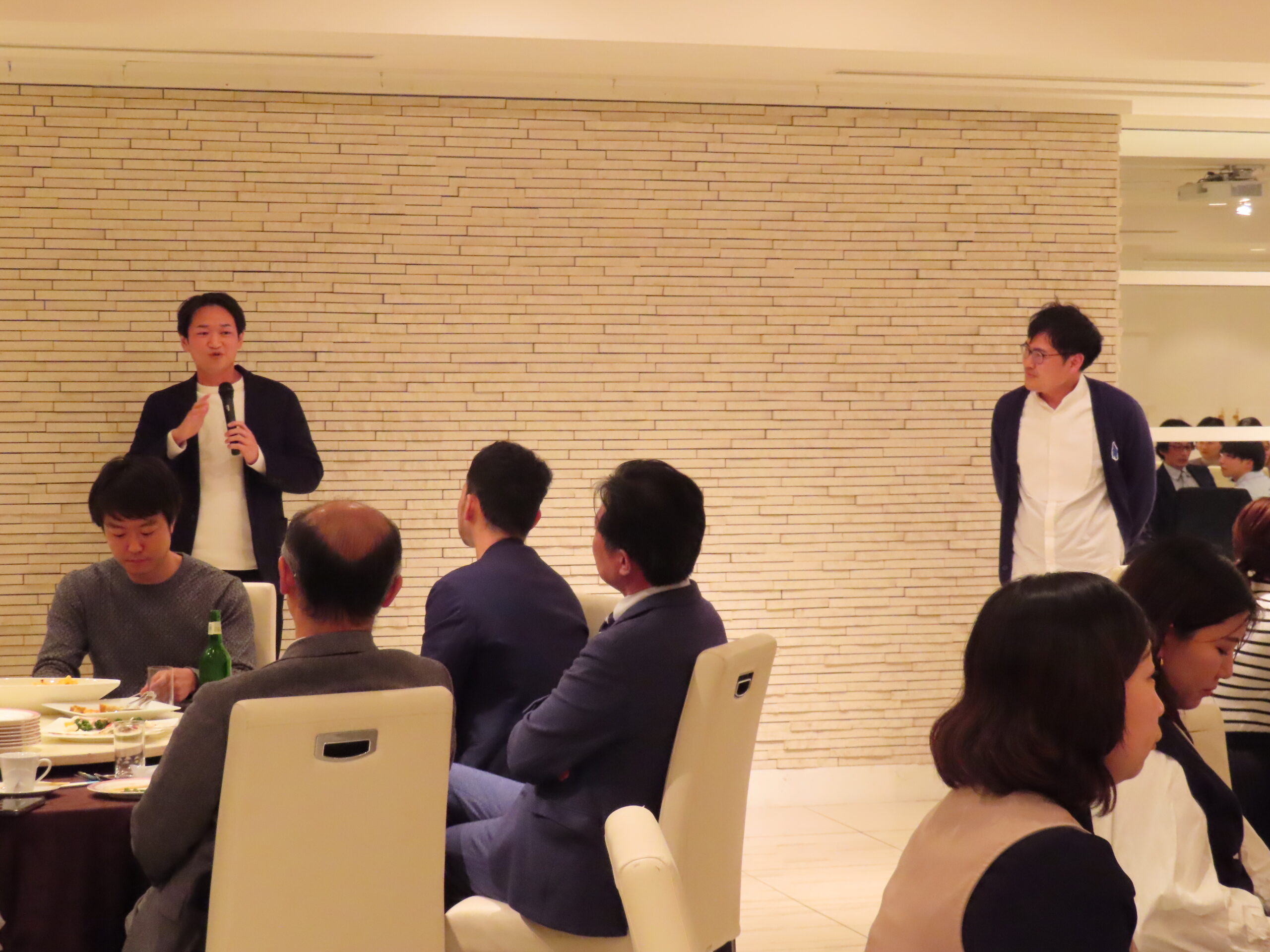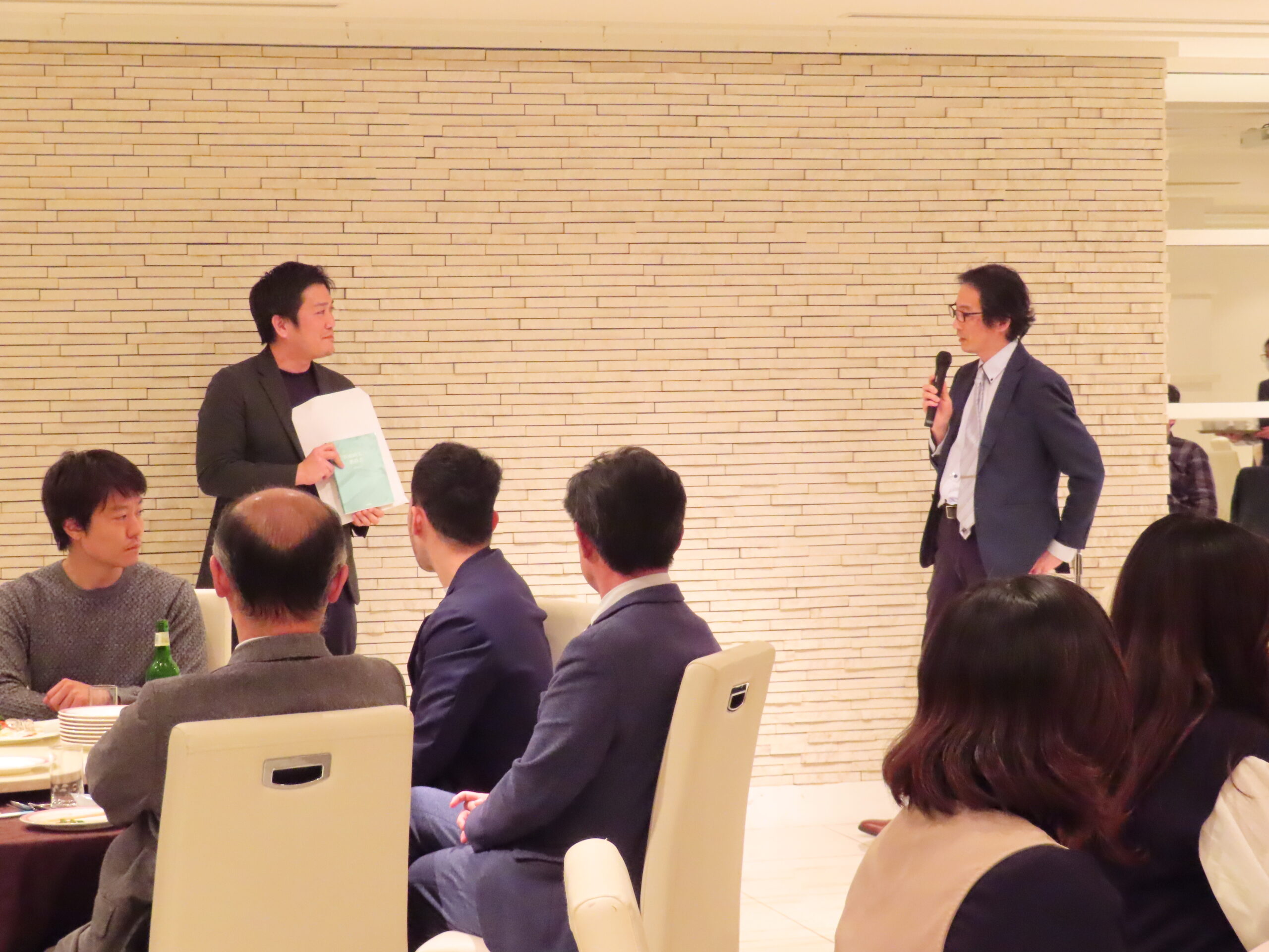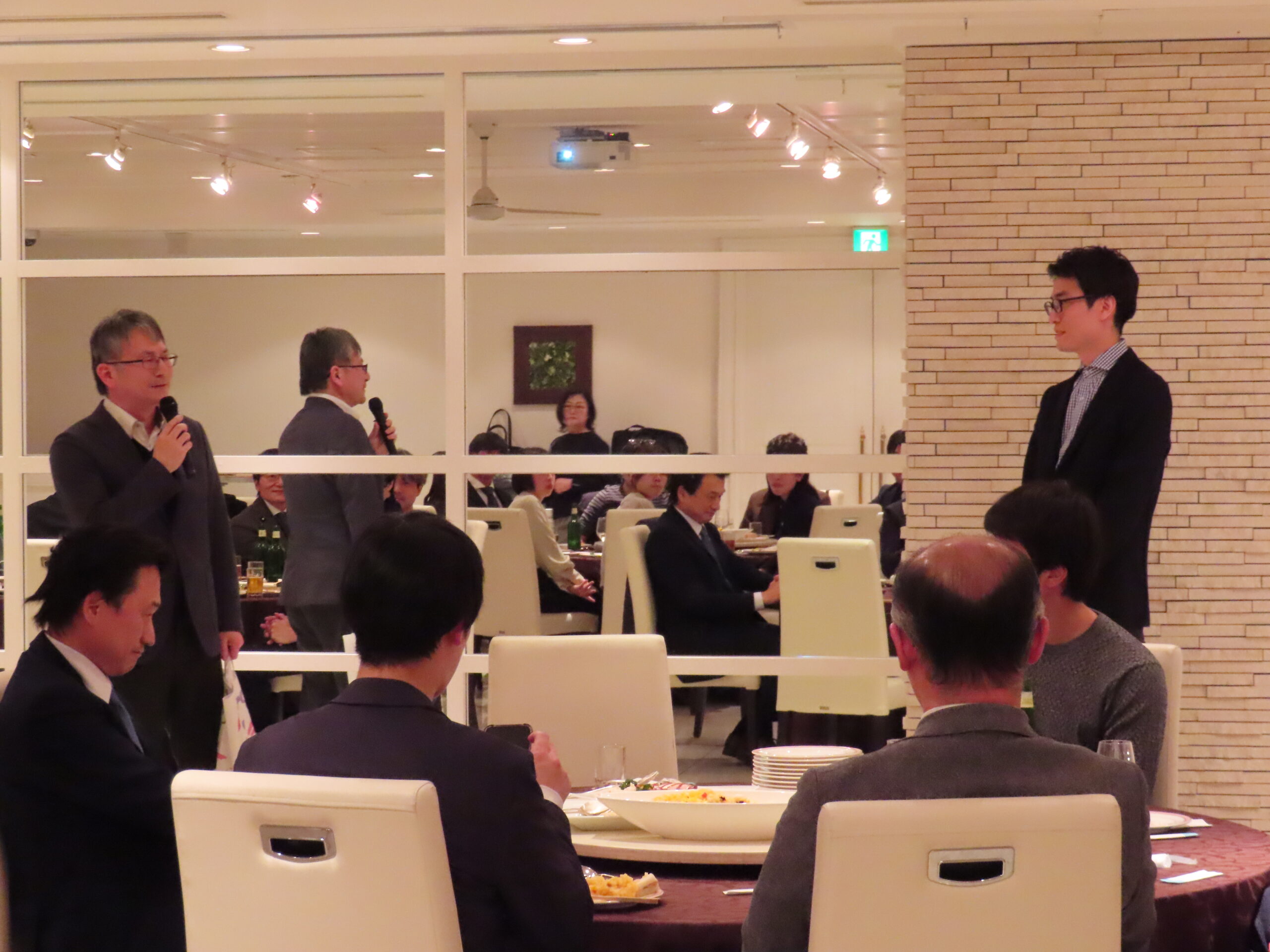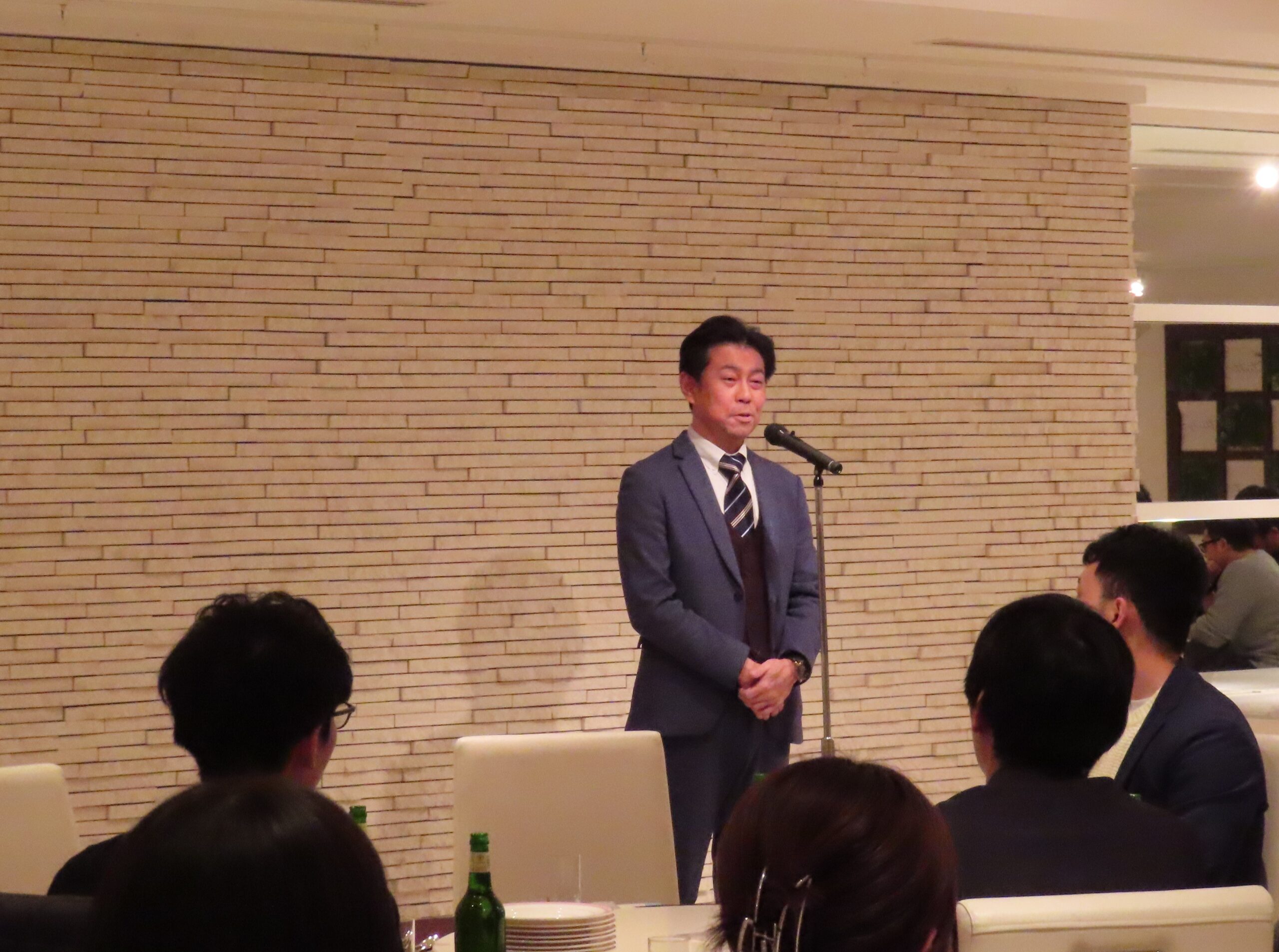 最初に大槻周平教授よりご挨拶をいただき、続いて馬場一郎准教授に乾杯のご発声をいただいて、会が始まりました。